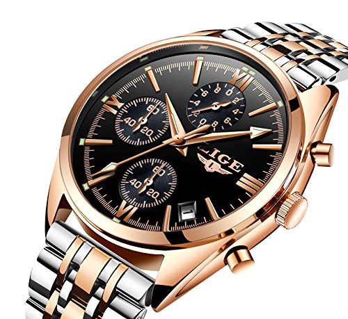 This attractive chronograph style timepiece from LIGE is accented by a sleek black dial.
