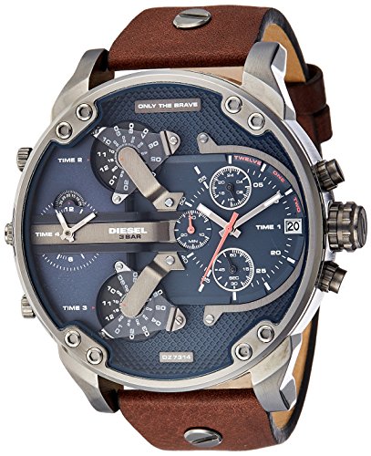 • Case size: 57mm; Band size: 28mm; quartz movement with 3-hand analog display, date window, and 3 chronograph subdials; mineral crystal face