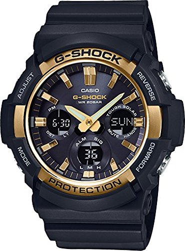 From G-SHOCK, the watch brand that is constantly setting new standards for timekeeping toughness, come new models based on the big case Tough Solar GAS-100. Variations on a basic black design are created by three different bezels. The GAS-100 comes with a stainless steel bezel for a standard design that goes well with a wide range of fashion styles, while the GAS-100G has a stainless steel bezel with a gold ion-plated finish for touch of distinctive beauty. The GAS-100B has a black aluminum bezel for a cool design. A CASIO original molding process is used to produce deposition coated hour markers that combine with the metal bezels to create a look of elegance. Size of case : 55.152.516.7mm. Shock Resistant.