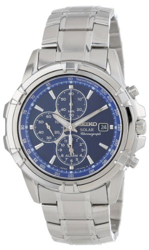 - Solar-powered watch featuring blue face with alarm, three sub dials, and date window