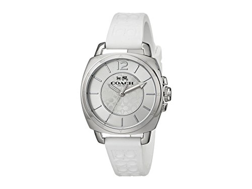 Stainless steel case with a white silicone strap. Fixed stainless steel bezel. Silver dial with luminous silver-tone hands and index hour markers. An Arabic numeral appears at the 12 o’clock positions. Minute markers around the outer rim. Dial Type: Analog. Luminescent hands. Quartz movement. Scratch resistant mineral crystal. Pull / push crown. Solid case back. Round case shape. Case size: 34 mm. Case thickness: 10 mm. Band width: 14 mm. Tang clasp. Water resistant at 30 meters / 100 feet. Functions: hour, minute, second. Casual watch style. Coach Boyfriend Signature Silver Dial Ladies Watch 14502093.