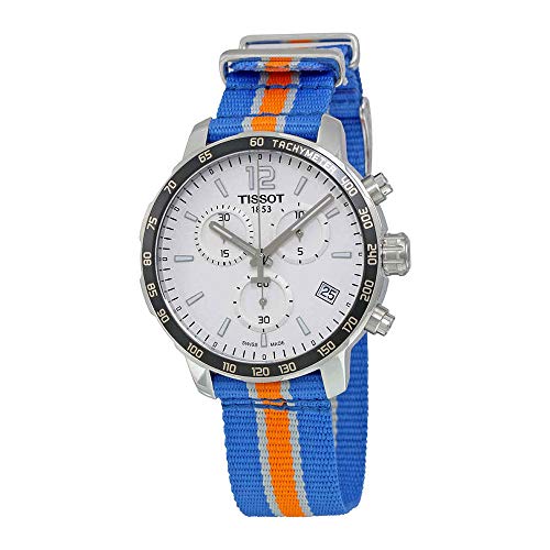 • Stainless steel case with a blue and orange synthetic nylon bracelet. Fixed bezel