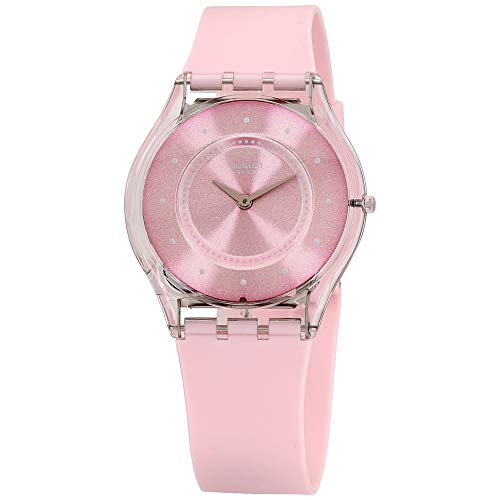 Swatch Skin Pink Pastel Pink Dial Silicone Strap Unisex Watch SFE111. 34 mm transparent plastic case with a pink dial and a plastic crystal. Silver tone hands. Stud hour markers. Hands: hours and minutes. Case thickness of 4 mm. Push / pull crown. 17 mm pink silicone strap. Buckle clasp. Quartz movement and water resistant up to 30 meters. Style: casual watches. Skin series.
