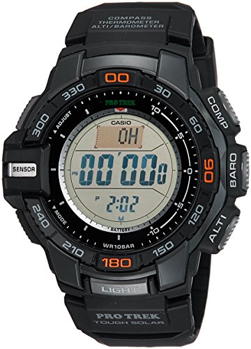 Introducing the Solar Powered PRG270 which incorporates Casio’s new Triple Sensor Version 3 engine. Advanced CASIO original technology has allowed for a 95% smaller direction sensor and 90% reduction in sensor power consumption compared to previous models. Despite their smaller size, the new sensors in this model deliver better accuracy and energy efficiency. This model can measure Altitude in 1m increments (previously 5m) and display compass readings with 60-seconds of continuous measurement (previously 20 seconds). In addition to the altimeter and digital compass, the watch’s Barometer, incorporates a unique Barometric Pressure Tendency Alarm that alerts the wearer to sudden changes in pressure readings.Design features include a case designed for outdoor gear performance. Large side buttons and one-press access to digital compass, barometric pressure and altitude, and temperature readings keep important information at your fingertips. Other features include Tough Solar, 100-meter water resistance, and more. Everything about these models is designed and engineered to make them essential pieces of outdoor gear. Black resin band digital with neutral face.