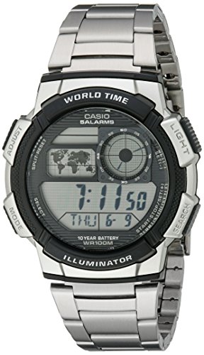 Sporty digital watch featuring 10-year battery, five alarms, world time (48 cities), stopwatch, countdown timer, and world map time zone display 44-mm resin case with glass dial window Quartz movement with digital display Stainless steel bracelet with fold-over clasp with double push-button safety Water resistant to 100 m (330 ft): In general, suitable for swimming and snorkeling, but not scuba divingCutting-edge technology combines with modern design in the Men’s Digital Sport Watch from reliable manufacturer, Casio. Encircled with large push buttons for easy operation, the durable, silver-tone case backgrounds a bold, black dial that features a world map time zone display, an analog sub-dial with Arabic numbers every five minutes, and a bright, digital display with day, date, and month information. The flexible stainless steel band wraps comfortably around the wrist and fastens with a secure fold-over clasp. With a stopwatch, timer, five alarms, 10-year battery, and a water resistant depth of 330 feet (100 meters), this high-performance timepiece will accompany you for years to come.