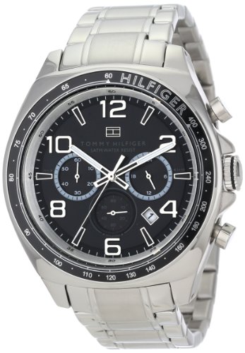 Dress watch, Japanese quartz movement, Chronograph featuring 24-hour, 60-minute and chronograph seconds subdials, Polished silver-tone hands with luminous accents, Polished silver-tone sweep seconds with white tip, Polished silver-tone hands with white tips mark subdials, Applied polished silver-tone Arabic numbers mark even-hour positions, Applied polished silver-tone hour markers with black accents, White/grey Arabic numbers and black indices mark subdials, White indices form minute track, Black Arabic numbers mark surrounding brushed silver-tone concave ring, Analog date aperture between four and five o’clock positions, Double-layer matte black dial with brushed subdials and polished silver-tone flag logo applique below twelve o’clock position, Polished silver-tone stainless steel bracelet with brushed inserts, adjustable links and push-button-clasp, Polished silver-tone stainless steel bezel with black top ring and tachymeter scale, Brushed/polished silver-tone stainless steel round case, Textured steel crown with engraved flag logo, Polished steel selector buttons, Stainless steel screw-down caseback, Mineral crystal, 5 ATM (50 meters/165 feet water resistant)