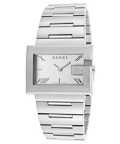 The 100G collection by Gucci is stylish, unique, and versatile. Its comfortable stainless steel bracelet, striking silver-tone dial and beautiful design make this particular timepiece a must-have for any woman’s collection. Complete yours today.From its G-shaped brushed steel bezel to the prominent Gucci name on the dial, this thoroughly modern ladies’ watch showcases unmistakable Gucci style. The broad rectangular steel case is gently curved to fit the contours of the wrist and featured on an attractive steel link bracelet finished with a secure push-button clasp. Silvertone baton hands adorn the silver-white dial, along with slender baton markers and fitted Roman numerals at the four corners. The dial is protected by a virtually scratch-proof sapphire crystal. A fluted steel crown, stamped with the G logo, provides a nice finishing touch. This watch offers precise Swiss quartz movement and is rated water resistant to 30 meters.