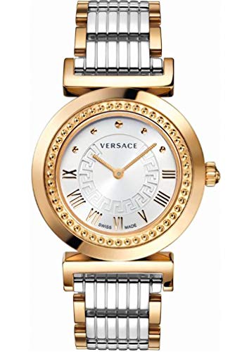- Stainless steel watch with rose gold ion-plated case and bracelet links, Greca pattern on sunray dial, and raised circular accents around bezel