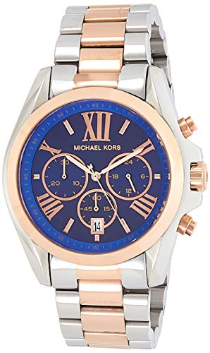 This Michael Kors timepiece features a shiny rose gold-tone and stainless steel case with a navy sunray dial. A two-tone bracelet finishes the look.