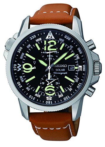 • Solar-powered watch with dual crowns featuring black compass dial with luminous hands/indices, date window, and two chronograph subdials