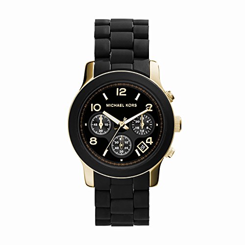 Black is always classic and Michael Kors updates this standby by wrapping the case and bracelet in sporty polyurethane. The glossy black dial is striking with the shiny gold-tone numerals and indexes.