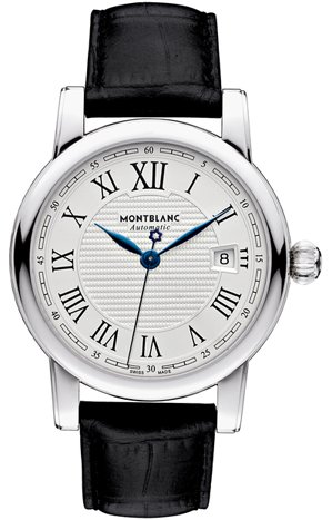 Stainless steel case with a black leather strap. Fixed stainless steel bezel. Silver guilloche dial with blue steel hands and Roman numeral hour markers. Minute markers around the outer rim. Dial Type: Analog. Date display at the 3 o’clock position. Self winding mechanical movement with a 42 hour power reserve. Scratch resistant sapphire crystal. Push / pull crown. Skeleton case back. Case diameter: 39 mm. Round case shape. Deployment clasp. Water resistant at 30 meters / 100 feet. Functions: date, hour, minute, second. Luxury watch style. Montblanc Star Date Automatic Silver Dial Black Leather Mens Watch 107114.