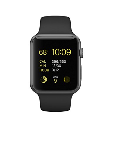 42mm Space Gray Aluminum Case with Black Sport Band Apple Watch Sport enables you to take a step ahead into the world of technology, no matter whether you’re a tech geek or a sports addict. This dependable and versatile wearable gadget helps you organize your daily activities efficiently and achieve your full potential. The unisex watch is a virtual wrist-worn assistant. With this Apple smartwatch on your wrist, you can receive and make calls, dictate text messages and send them to your friends or colleagues, call a taxi, browse through plenty of apps, and even track your fitness activity – all this without the need to even take your smartphone out. The Digital Crown on the Apple Watch Sport, visually resembling the analog winding mechanism on the mechanical watches, helps you swipe through app icons on the 42mm Ion-X OLED Retina display, while the side button gives you an easy access to your preferred contacts. Moreover, with its help you can send personal messages to your friends or even your heart pulse to your significant other via taps, in case they own an Apple smartwatch too. In a similar way, the unique Taptic Engine is designed to give you delicate and fully customizable nudges when you get a notification. With up to 18 hours of battery life, the Apple smartwatch is always there when you need it during your daily routine. In addition, this unisex watch helps you exercise and work out in style with its sleek space gray aluminum case and black sport band. Features Spa…