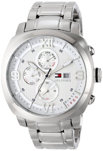 Dress watch, Quartz movement, Multifunction featuring 24-hour, day and month subdials, Polished silver-tone skeleton hands with luminous accents, Glossy navy sweep seconds, Polished silver-tone hands mark subdials, Applied polished silver-tone Roman numerals mark twelve and six o’clock positions, Applied polished silver-tone Arabic numbers mark three and nine o’clock positions, Applied polished silver-tone hour markers, Red/navy print, Arabic numbers and indices mark subdials, Navy Arabic numbers and indices form surrounding minute track, Analog date aperture near three o’clock position, Double-layer matte silver-white dial with pinstripe texture, brushed silver-tone subdials and glossy red/white/navy flag logo applique near three o’clock position, Brushed silver-tone stainless steel bracelet with polished inserts, adjustable links and push-button-clasp, Polished silver-tone stainless steel bezel, Brushed silver-tone stainless steel cushion-shaped case with polished accents, Textured steel crown with ‘H’ logo, Polished steel selector buttons, Stainless steel caseback, Mineral crystal, 5 ATM (50 meters/165 feet water resistant)