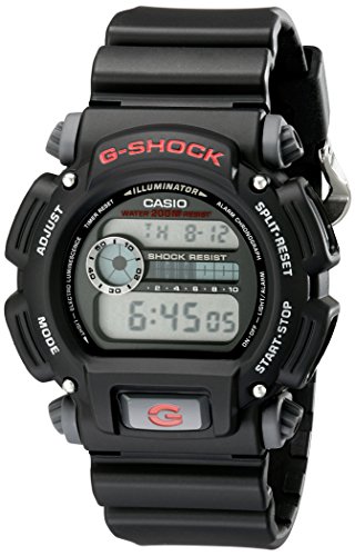 The simply designed Casio G-Shock Classic digital watch for men offers shock resistance that’s great for your most vigorous sporting activities. The durable rectangular black watch case measures 45mm wide (1.77 inches), and it’s matched to a comfortable black resin sports strap. The face has two windows that show time (bottom) and date (top) as well as a circular display for the stopwatch function, which can measure events down to 1/100 of a second for the first 60 minutes (and down to 1 second from 60 minutes to 24 hours). It also offers elapsed and split time modes, and 1st-2nd place times, and it includes a countdown timer with a 24-hour range. Other timekeeping features include a multi-function alarm, hourly time signal (which can be turned off), and 12/24-hour formats. This timepiece also features an Auto Calendar (pre-programmed until the year 2039), ±15-second accuracy per month, Afterglow backlighting, and water resistance to 200 meters (660 feet)–which will stand up to the rigors of recreational scuba diving.