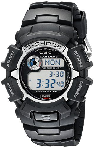 Based on the popular Tough Solar model, G2310 introduced back in 2001, G-Shock introduces a new Solar Atomic version, the GW2310. Now updated with Multi-Band Atomic Timekeeping, it’s more powerful than ever while retaining the classic, utilitarian case shape of its predecessor for clean yet rugged styling.Innovative technology combines with classic sport styling to bring you the Casio Men’s G-Shock Solar Atomic Watch. With helpful text lining the black resin bezel, it’s easy to program handy functions like the stopwatch, countdown timer, five alarms, World Time with 31 time zones, and 12- and 24-hour formats. You’ll love the convenient solar-powered battery, which can operate for up to 10 months on a full charge. A bright EL backlight automatically turns on with the movement of your wrist, and the round, black dial features clearly divided sub-dials with a wealth of information, including a day, date, and month display. With reliable shock resistant technology, a water resistant depth of 660 feet (200 meters), and the handy capacity to automatically receive official atomic time through a built-in antenna, this cutting-edge timepiece is perfect for the adventurous man. Please see page E-3 in the manual, here it states the watch would need approximately 5 minutes of exposure to bright sunlight coming in through a window and 8 hours of exposure to indoor fluorescent lighting. Please see page E-45 in the manual, the G-shock button should be pressed and held for a few seconds for the Auto EL function to be turned on. The auto light switch must be turned on ( indicated by the auto light switch-on indicator) for it to operate.Please see page E-72 in the manual for any trouble shooting instructions.