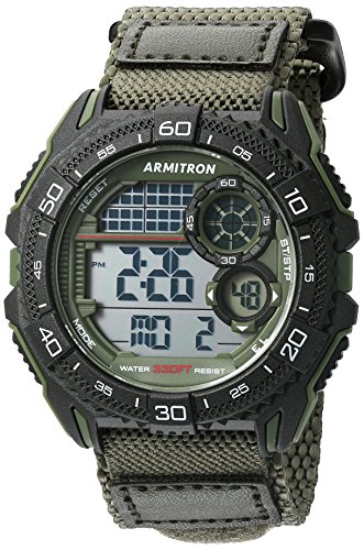- Army green resin case with metallic black top ring; LCD display with time, seconds, day and date; army green nylon strap with hook-and-loop closure