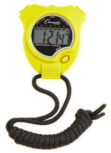 The Champion Sports Stopwatch is a simple, easy-to-use stopwatch that is packed with features. The big digital display stopwatch includes 1/100 of a second precision, a lap counter, and 12 or 24 hour formats for runners, coaching, or sports training. Other useful features include calendar and time display, a daily alarm, and an hourly chime. It is also water and shock resistant, so you can train your hardest without having to worry. This stopwatch is available in your choice of black, blue, green, orange, purple, red, white, or yellow, so you can exercise in style!