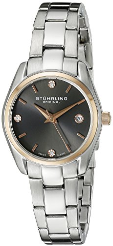 The polished stainless steel and brushed case of this Stuhrling Original watch make it a classic piece while a rose-tone bezel and SWAROVSKI CRYSTAL accents lend a touch of feminine glamour. Swiss Quartz movement with analog display Protective Krysterna crystal dial window Features include SWAROVSKI CRYSTAL accents, date window at three o’clock position, second hand, triple-row link bracelet, and push-button clasp Water-resistant to 100 m (330 feet)