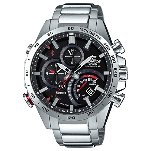 Casio Edifice introduces a stylish timepiece for anyone who likes to stay connected while on the go. With the use of Blutooth(R) SMART technology, this Casio Edifice watch can sync with an app on your smartphone to allow you to adjust hand positions, set alarm times and the World time dial, ping your phone if it’s lost, and more. In addition to the World Time 12-hour dial at 7 o’clock that shows the current time in a second location and a new sporty chronograph like design that uses the same coloring as a tachymeter for the speed indicator at 4 o’clock. Although this watch has powerfully bold designs, it is engineered in such a way that it is thinner than other Edifice styles making for a great look and comfortable fit.