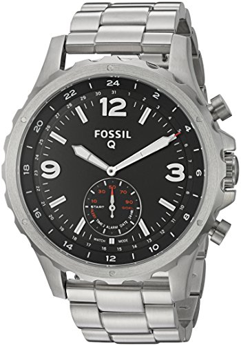 Meet Q Nate, our military-inspired hybrid smartwatch that blends analog design with smart connectivity. Strapped in sleek stainless steel, the Q Nate features Arabic and stick indices with a black dial and silver-tone brushed case. Using Bluetooth technology, receive smartphone notifications and accomplish daily fitness goals when the hour, minute and sub-eye hands spin or the watch case vibrates. Set an alarm, view 24-hour time, compare time in multiple time zones and track everything from steps to calories to sleep. Press the bottom pusher to take a photo, control music or find your phone with the help of our Fossil Q App. Customize your look with interchangeable straps. Q Nate’s simplicity and connectivity makes for the perfect on (or off) road companion.